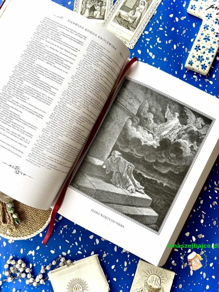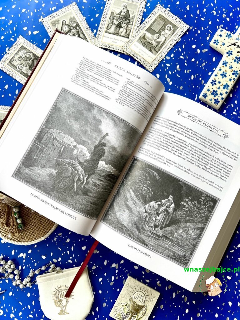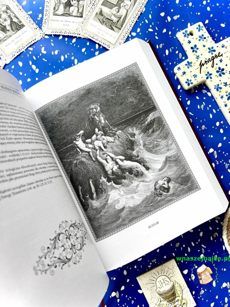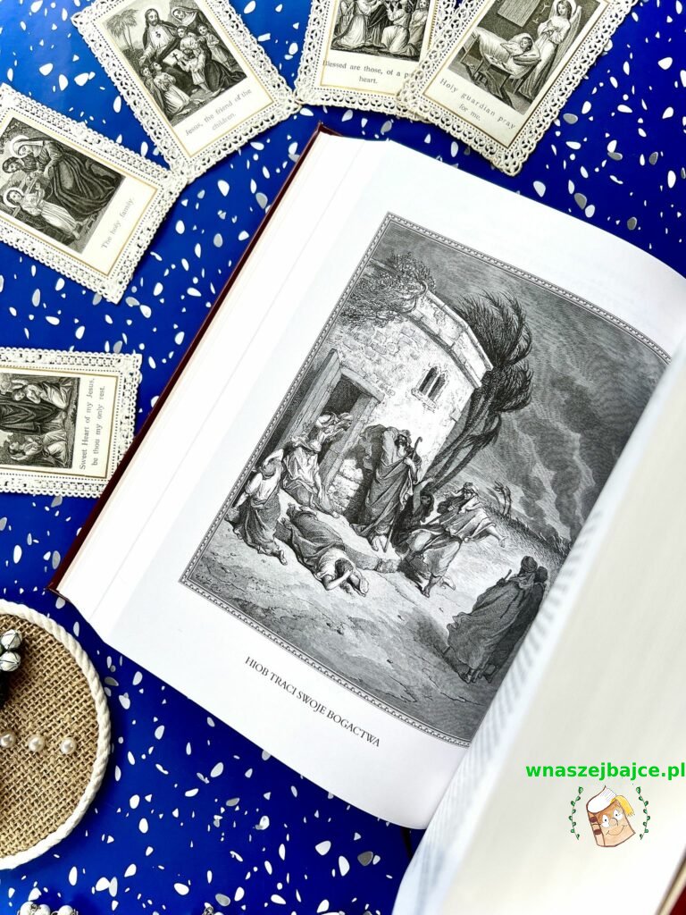 Samo wydanie robi ogromne wrażenie. Ilustracje Gustave’a Doré są po prostu poruszające: pełne emocji, światła i cienia, które oddają głębię biblijnych historii. Patrząc na nie, ma się wrażenie, że te opowieści stają się bliższe, bardziej ludzkie. Do tego dochodzą subtelne, złote zdobienia, twarda oprawa i piękna tasiemka – zakładka – wszystko to tworzy całość, która jest nie tylko książką, ale prawdziwym przedmiotem o wartości sentymentalnej.