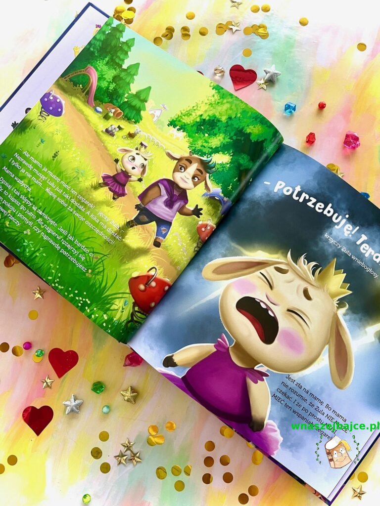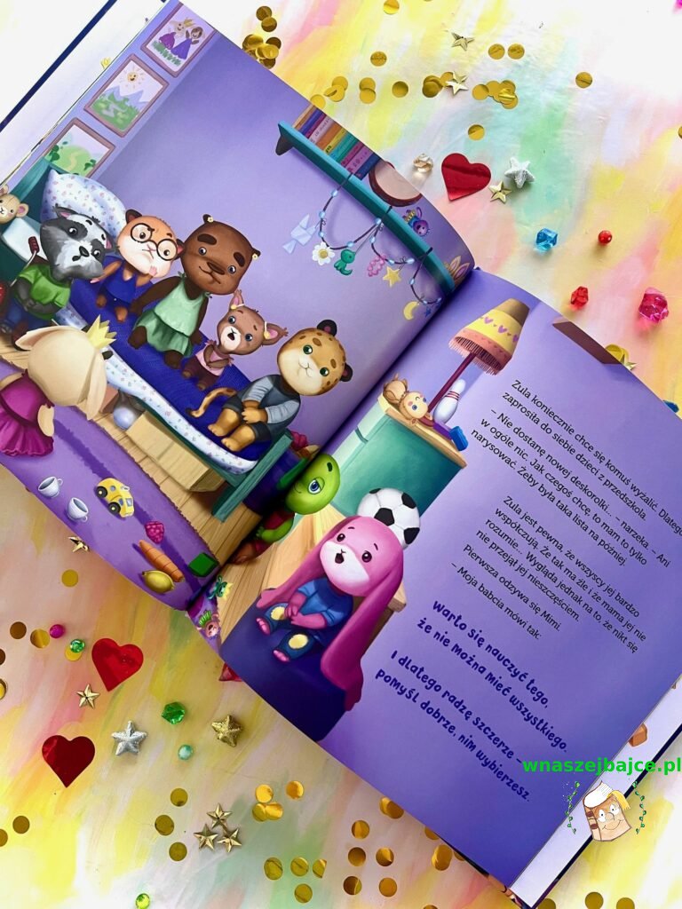Zula widzi reklamy, słyszy zachwyty innych i sama marzy o przedmiotach, które wydają się niezbędne: o zegarku, o figurkach, o deskorolce. Każda rzecz jawi się jako ta wyjątkowa, ta, bez której nie da się żyć. Mama Zuli jednak patrzy nieco dalej i zamiast kupować kolejne gadżety, uczy córkę cierpliwości, zastanowienia i doceniania tego, co już ma. Bo przecież jej pokój pęka w szwach od zabawek, a jednak nie to daje prawdziwą radość.