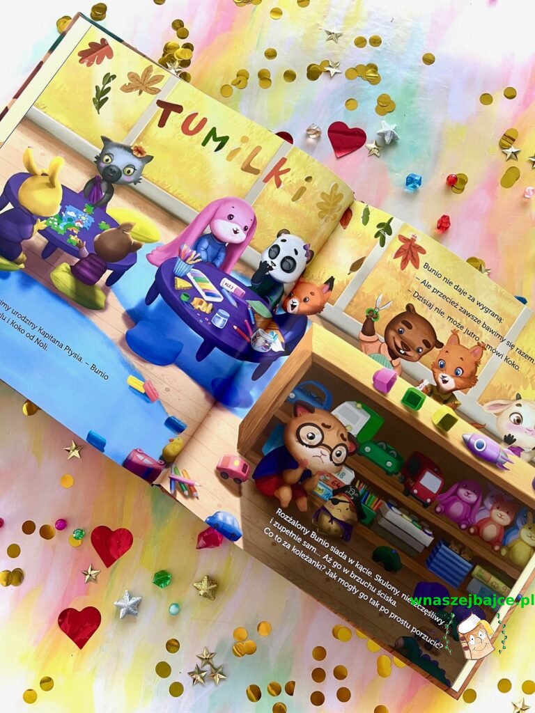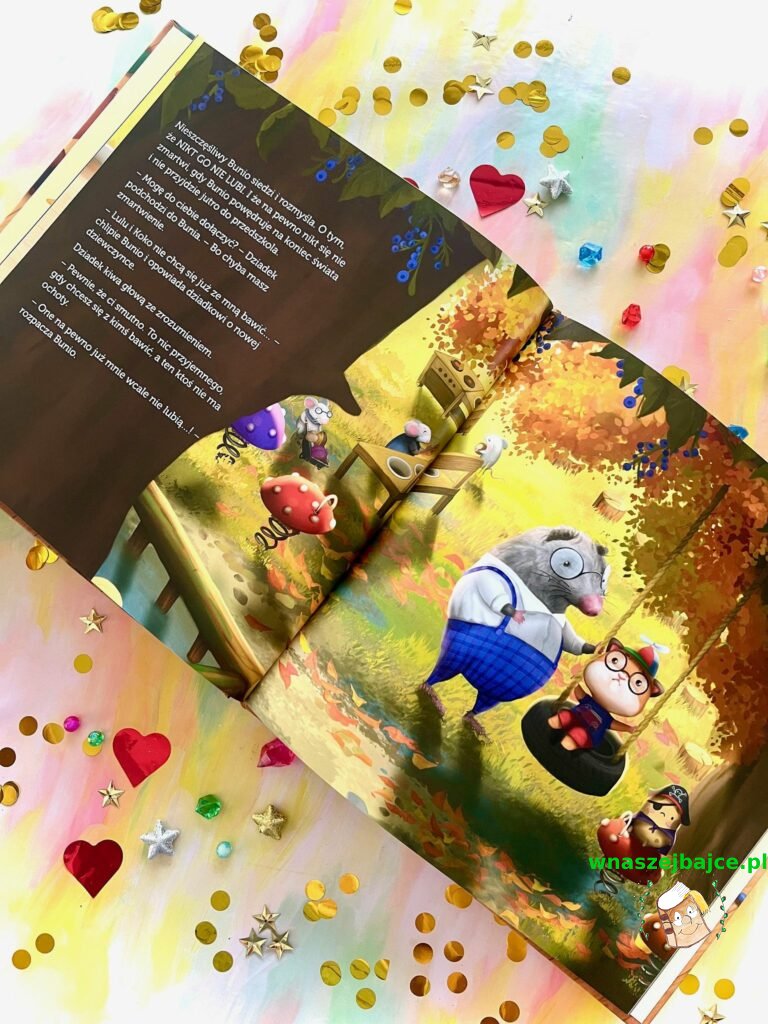 „Bunio chce się bawić” z wydawnictwa Tumilu to książka pełna ciepła, humoru i mądrości. Dzięki rozmowom z dziadkiem Bunio odkrywa, że przyjaźń nie jest na wyłączność, że inni mogą bawić się z kimś nowym, a mimo to nadal mogą go lubić i cenić. Uczy się także, że warto czasami samemu podjąć inicjatywę – podejść, zapytać, dołączyć do zabawy lub wymyślić własną – bo często to właśnie wtedy powstają najpiękniejsze przygody.