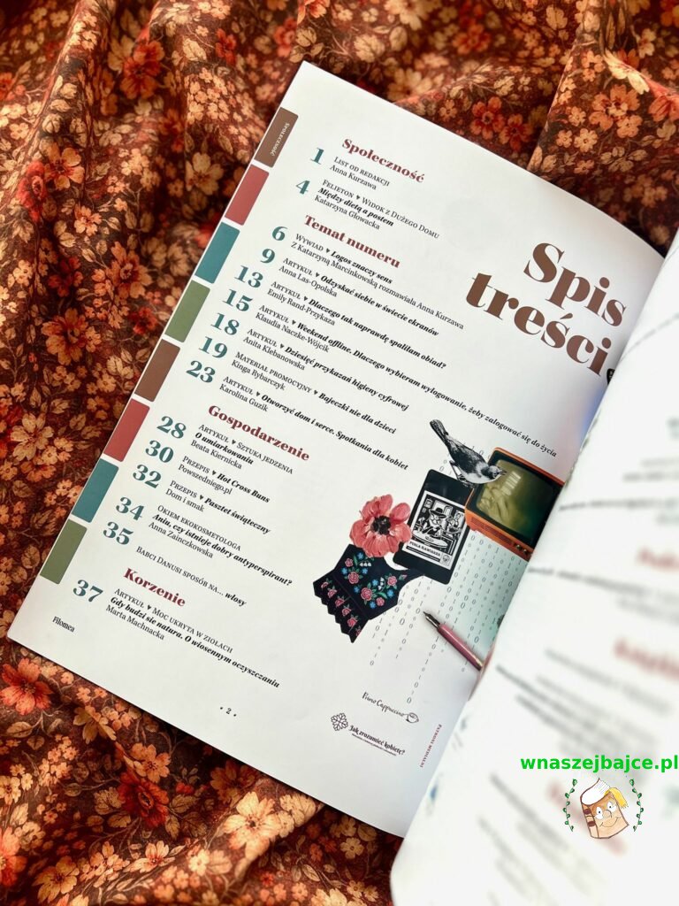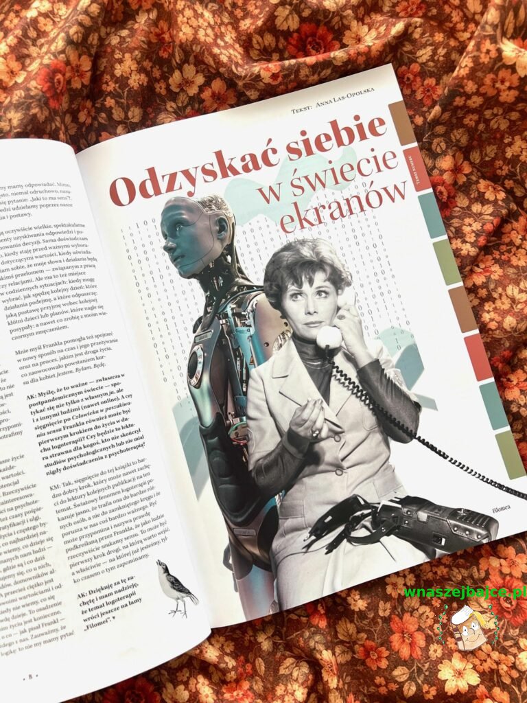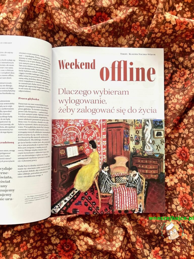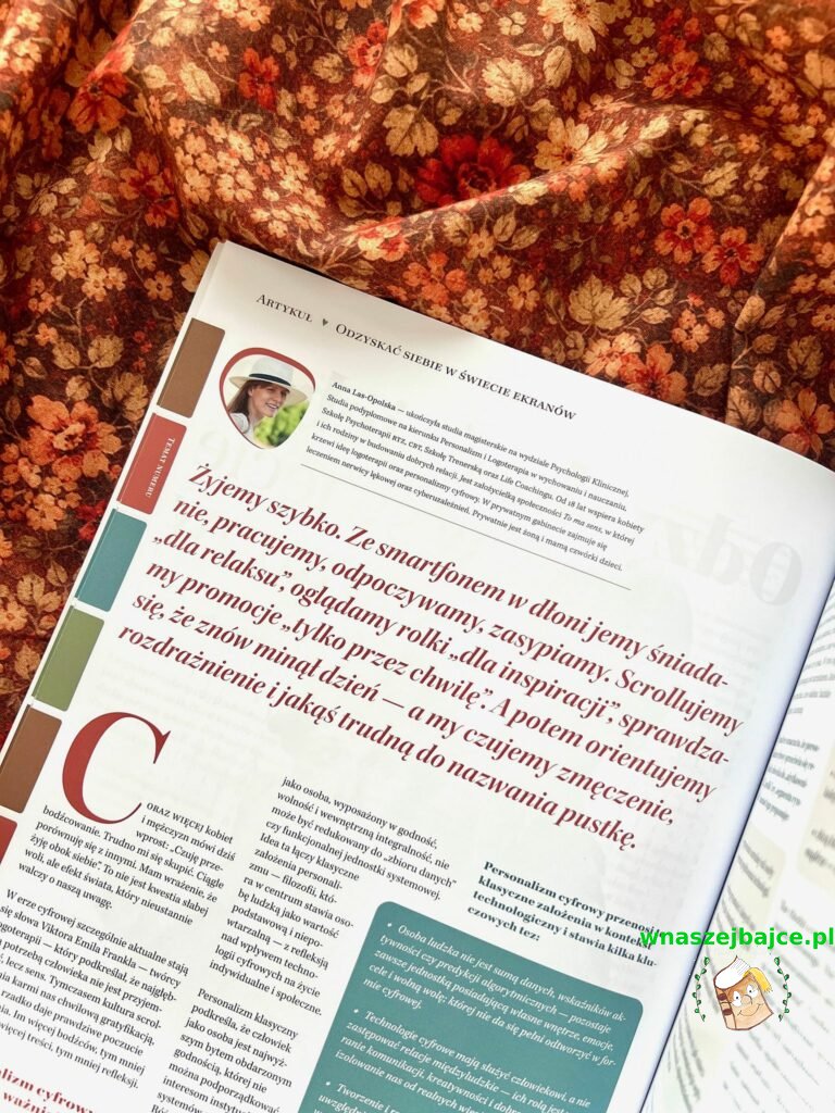 W tym kontekście niezwykle ciekawy jest też artykuł Emily Rand – Przykaza o odzyskiwaniu skradzionej uwagi, o tym, jak znów nauczyć się skupienia. A tekst Klaudii Naczke-Wójcik „Weekend offline. Dlaczego wybieram wylogowanie, żeby zalogować się do życia” to piękna opowieść o higienie cyfrowej i o tym, że czasem naprawdę warto odłożyć telefon, by wrócić do świata prawdziwych relacji.