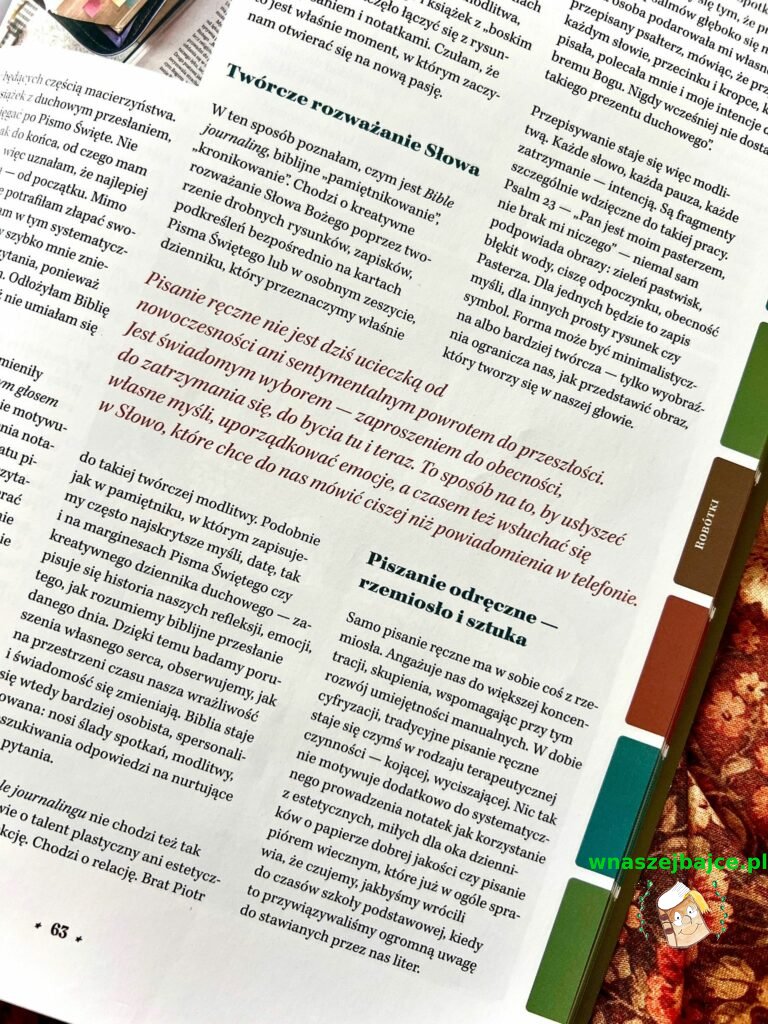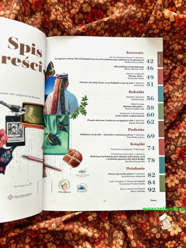 W numerze znajdziemy także piękne rzeczy dla duszy: poezję, pieśń wielkanocną z nutami, tekst o podhalańskich strojach, portret artystki Kamili Kansy czy niezwykle inspirujący artykuł siostry Beaty Zawiślak o kaligrafii. Przyznam szczerze, że po jego przeczytaniu sama mam ochotę spróbować tej sztuki.