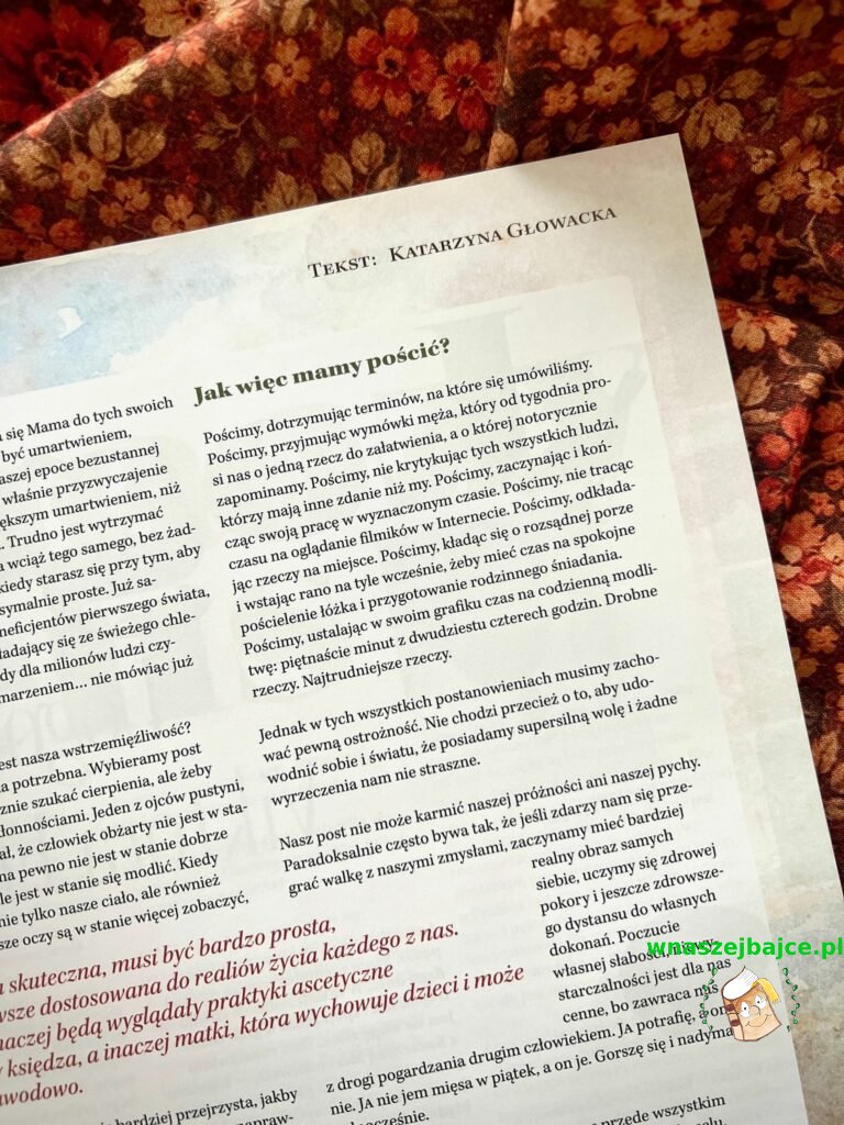 Jednym z felietonów, który szczególnie mnie poruszył, jest tekst Katarzyny Głowackiej „Między dietą a postem”. To niezwykle mądra refleksja o tym, czym naprawdę jest post i jak go przeżywać. Tak trafna, że mam wrażenie, iż ten tekst warto byłoby wydrukować i powiesić gdzieś w widocznym miejscu. Pokazuje post nie jako wyrzeczenie dla samego wyrzeczenia, ale jako drogę do sensu i porządku w życiu.