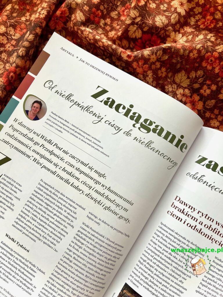 Ogromnie zainteresował mnie również artykuł o dawnych zwyczajach wielkopostnych na wsi, o tym, jak Wielki Post poprzedzało przedpoście, jak oswajano ciszę Wielkiego Piątku i jak wyglądało wielkanocne świętowanie. Ile można się z tych dawnych tradycji nauczyć!