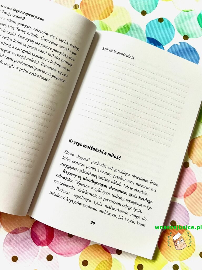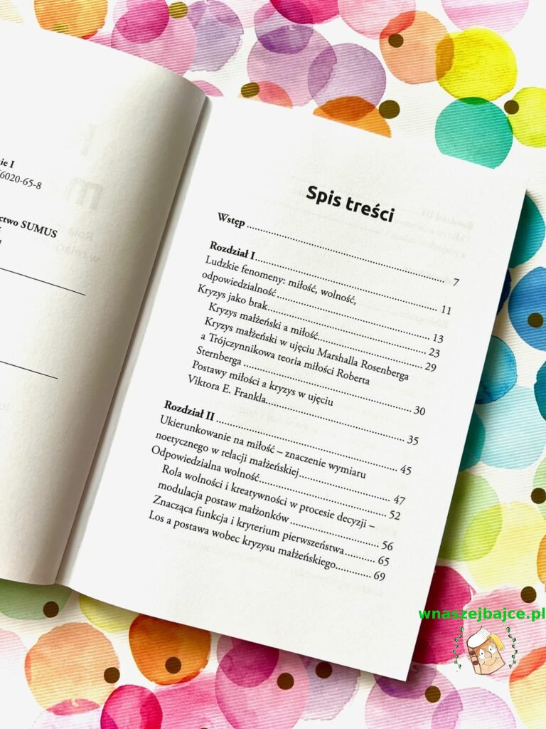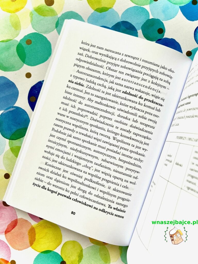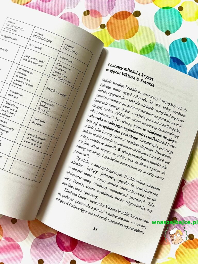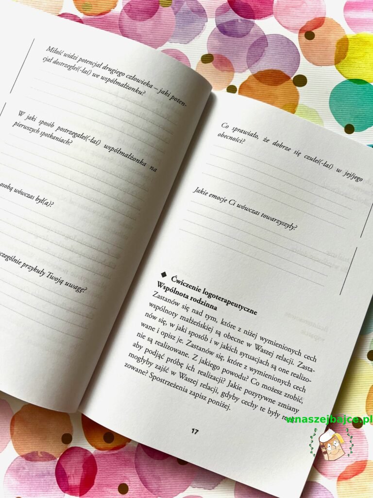 Autorka prowadzi czytelnika krok po kroku, pokazując, że małżeństwo nie jest tylko relacją dwojga ludzi, ale duchową podróżą. W tej podróży uczymy się dialogu, zaufania i wzajemnego zrozumienia. Książka zawiera konkretne ćwiczenia i refleksje oparte na logoterapii Frankla, które pomagają w praktyce rozwijać komunikację i umiejętność słuchania, umacniać więź emocjonalną, odnajdywać wspólne wartości i sens, budować zaufanie i bliskość w zwykłych, codziennych chwilach.