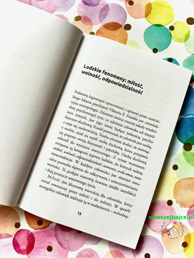 Viktor Frankl, psychiatra, więzień obozów koncentracyjnych, autor koncepcji logoterapii, udowodnił, że człowiek nawet w największym cierpieniu może odnaleźć sens. Aneta Bednarska czerpie z jego nauki pełnymi garściami, pokazując, że właśnie w relacji z drugim człowiekiem, w codziennych wyborach, w odpowiedzialności za „nas” kryje się głęboki sens życia.
