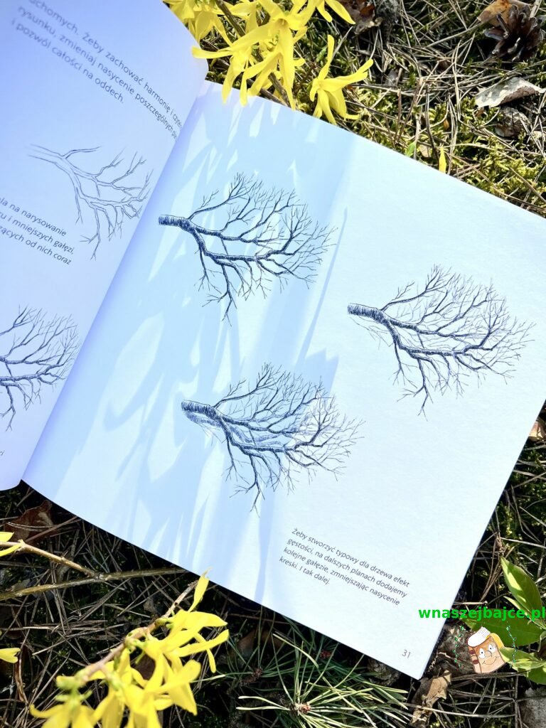 Dalsza, główna część książki to obszerne kompendium praktycznych ćwiczeń. Czytelnik krok po kroku uczy się rysować drzewa – od struktury pnia i kory po liście i rozłożyste korony. Równie szczegółowo omówione zostały kwiaty, ich budowa, perspektywa, cieniowanie oraz tworzenie kompozycji. Nie zabrakło także innych elementów przyrody, takich jak trawy, krzewy, mchy, grzyby czy rośliny użytkowe. Autorka prowadzi nas również przez bardziej złożone tematy – martwą naturę, wodę i kamienie, a nawet zwierzęta: od owadów i ptaków po gatunki domowe. Na końcu pojawiają się zagadnienia dla bardziej zaawansowanych, takie jak rysowanie krajobrazów – wiejskich zabudowań, gór, jezior czy zmieniających się pór roku. Zakres materiału jest naprawdę imponujący!