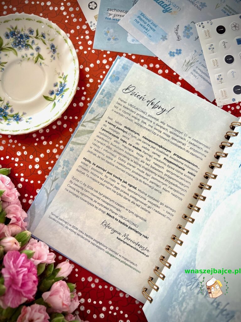 Są takie prezenty, które od razu trafiają prosto w serce. Niedawno dostałam Planer UBOGACONEJ 2026 – pięknie zapakowany, pachnący nowością i obietnicą dobrze przeżytego roku. Już przy pierwszym otwarciu wiedziałam, że to nie będzie zwykły kalendarz. Delikatne, akwarelowe niezapominajki, miękki papier, przemyślany układ, wszystko w nim zachęca, by zwolnić, zapisać myśli i zaplanować każdy dzień w duchu wdzięczności.