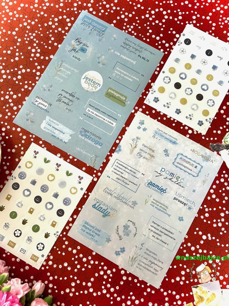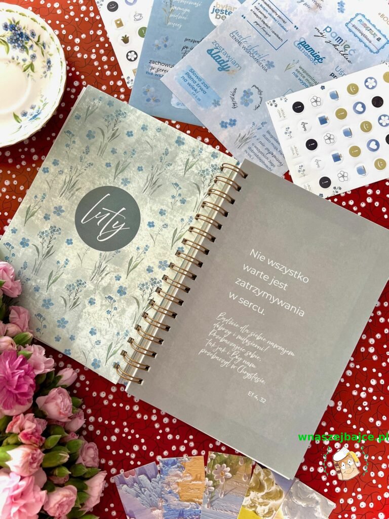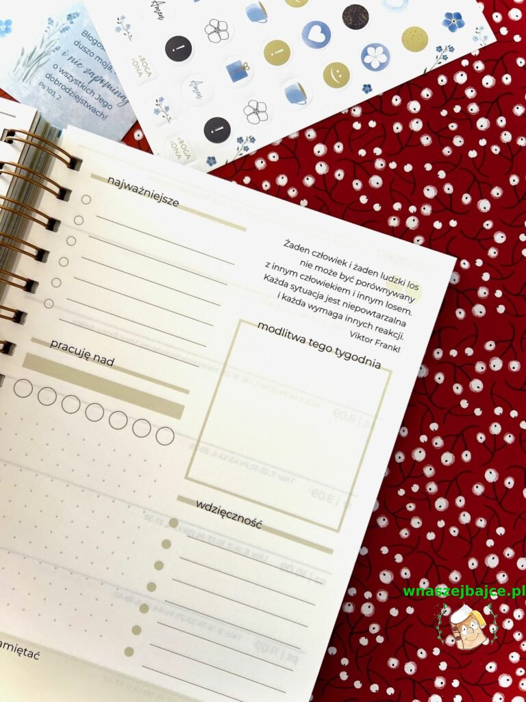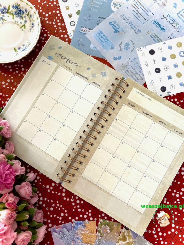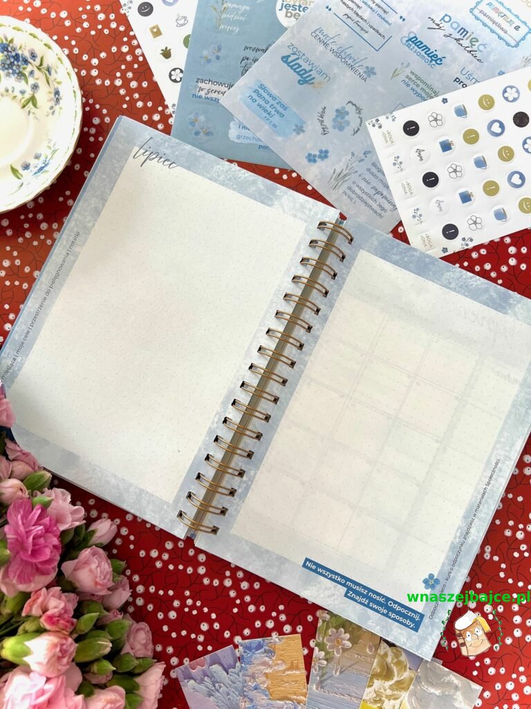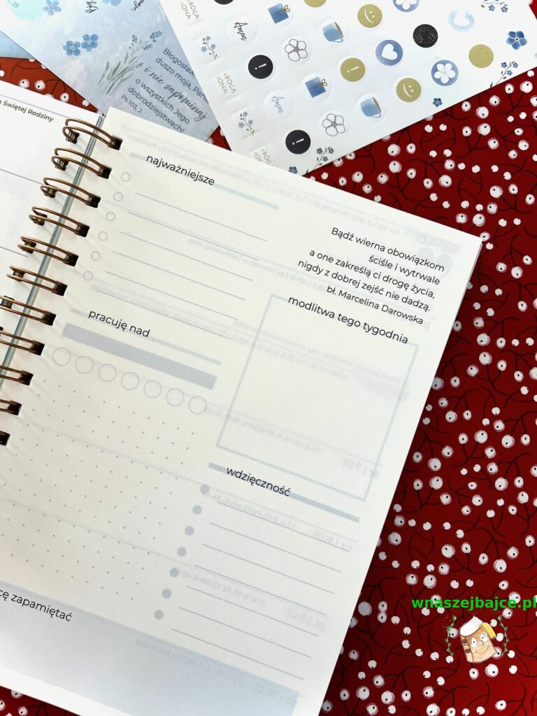 Autorki pomyślały też o przestrzeni na formację i osobiste przemyślenia, o inspirujących cytatach i delikatnych przypomnieniach, by pielęgnować wdzięczność. Dodatkowo w zestawie znajdują się dwa arkusze pięknych naklejek, pełne niezapominajek i motywujących słów, które sprawiają, że planowanie staje się małą przyjemnością dnia codziennego.