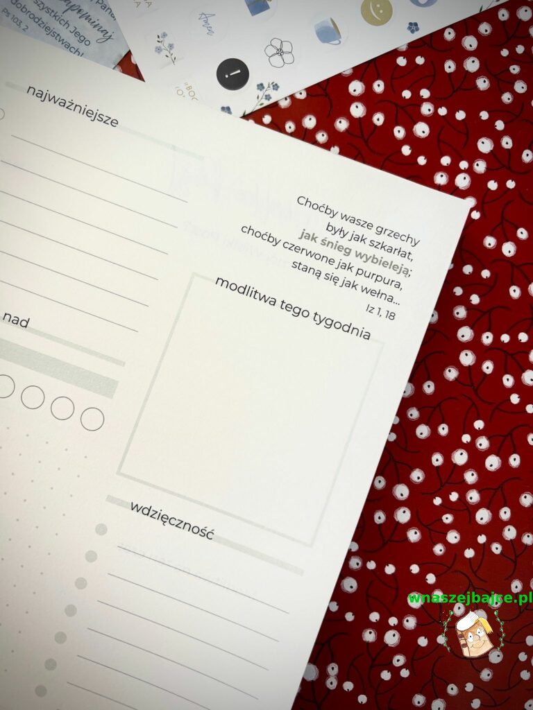 • widok tygodniowy z miejscem na codzienne notatki, refleksję i modlitwę;
