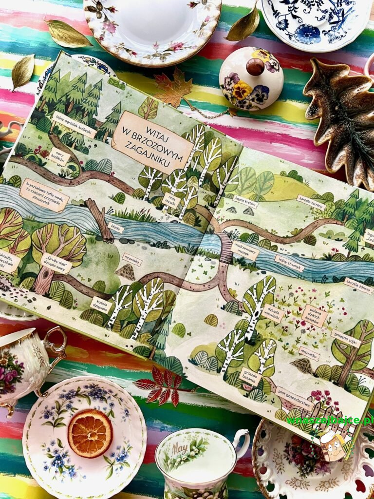 Moje serce skradła nie tylko słodka, czuła rodzina jeżyków, ale pomysłowa mapka na wyklejce z Brzozowym Zagajnikiem. Jejku, ileż tutaj maluszki mogą mieć pomysłów na zabawę. Szukanie nory królików, gniazda bażanta, czy polany dzikich kwiatów może stać się wspaniałą rodzinną zabawą, a gdy później wybierzecie się na spacer do lasu możecie wspominać Brzozowy Zagajnik z książki, lub szukać podobnych zakątków, które poznaliście w tej opowieści.