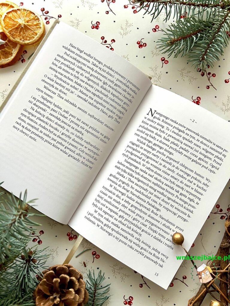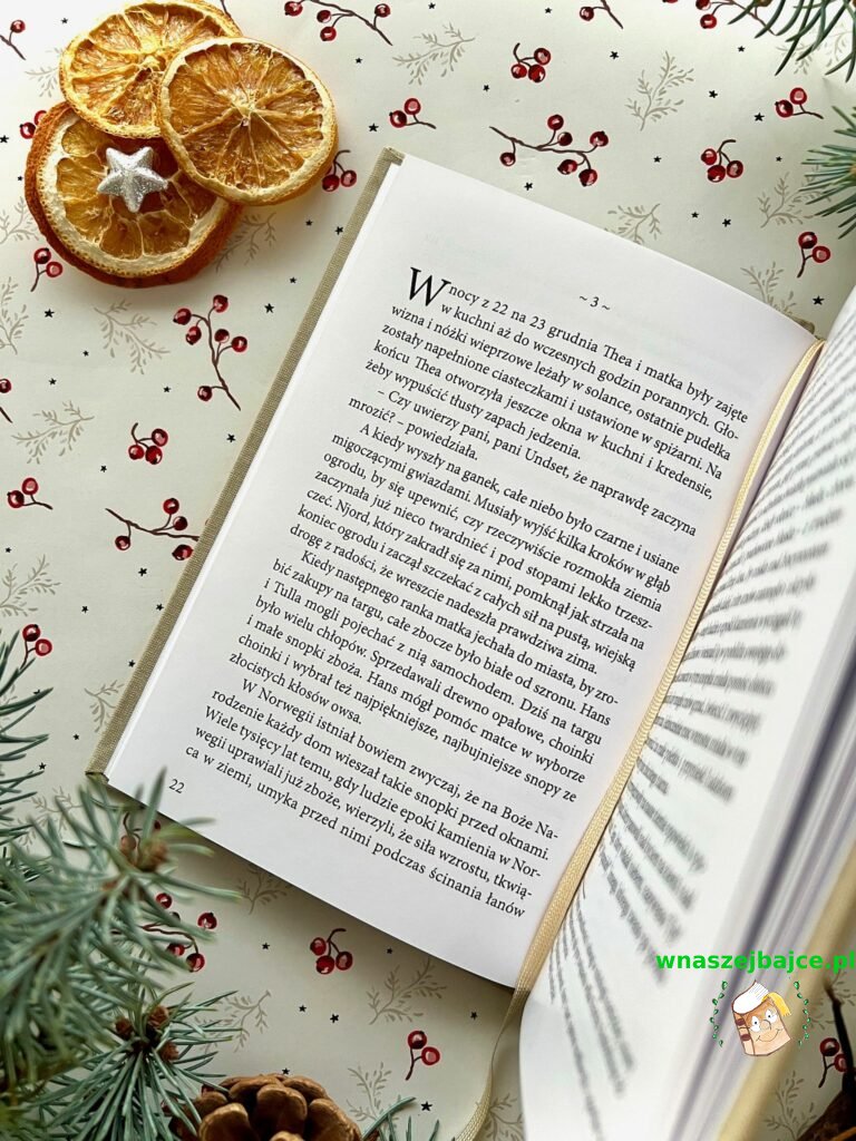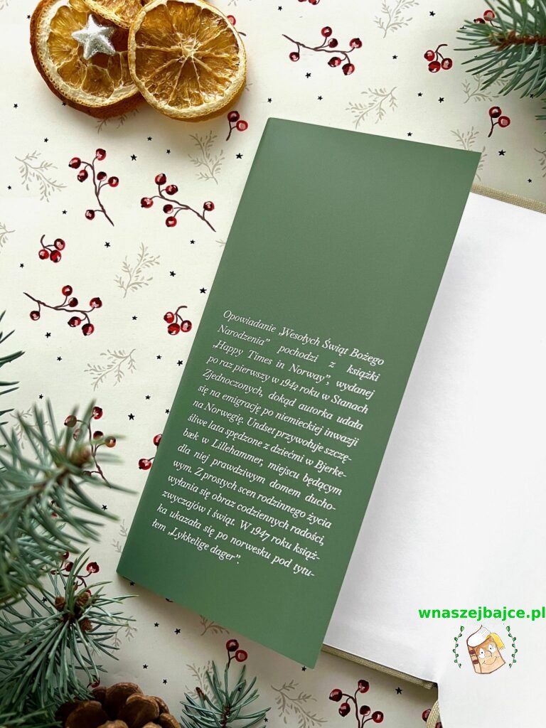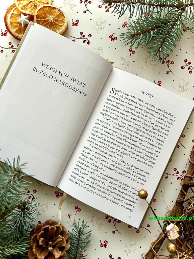 Sigrid Undset zaprasza nas w świat norweskich krajobrazów oraz smaków, które gościły na stołach. Poczujemy świąteczną atmosferę, przyjrzymy się krzątaninie w domu, poznamy tradycje i zwyczaje oraz zobaczymy matkę, która w chwili odpoczynku od pracy zagląda do pokoju niepełnosprawnej córki, by tulić ją na kolanach i śpiewać jej cicho… Prostota życia, rozmowy, zwyczajne obowiązki, życie bez fajerwerków, a jednak jest coś magnetycznego, co sprawia, że pragnie się tę rodzinę poznać bliżej…