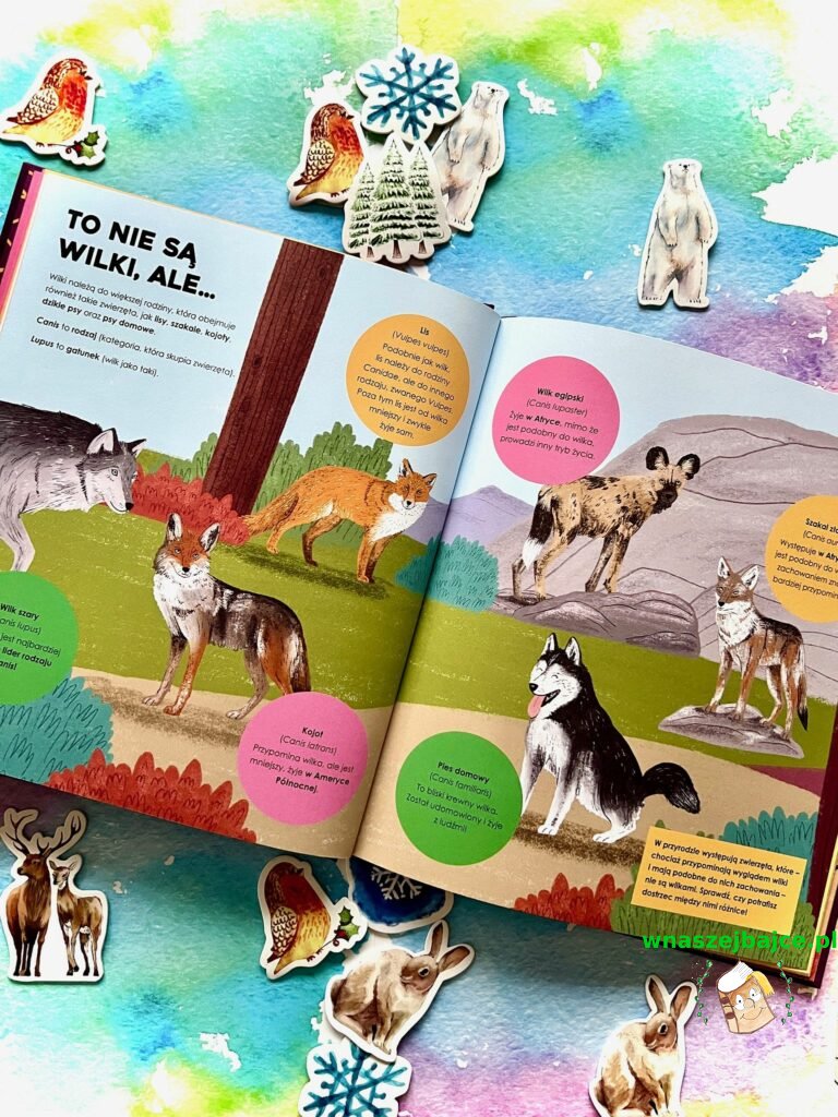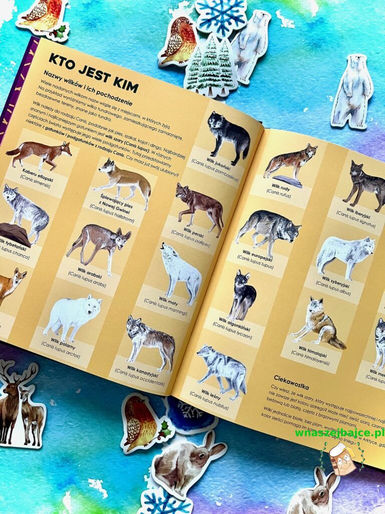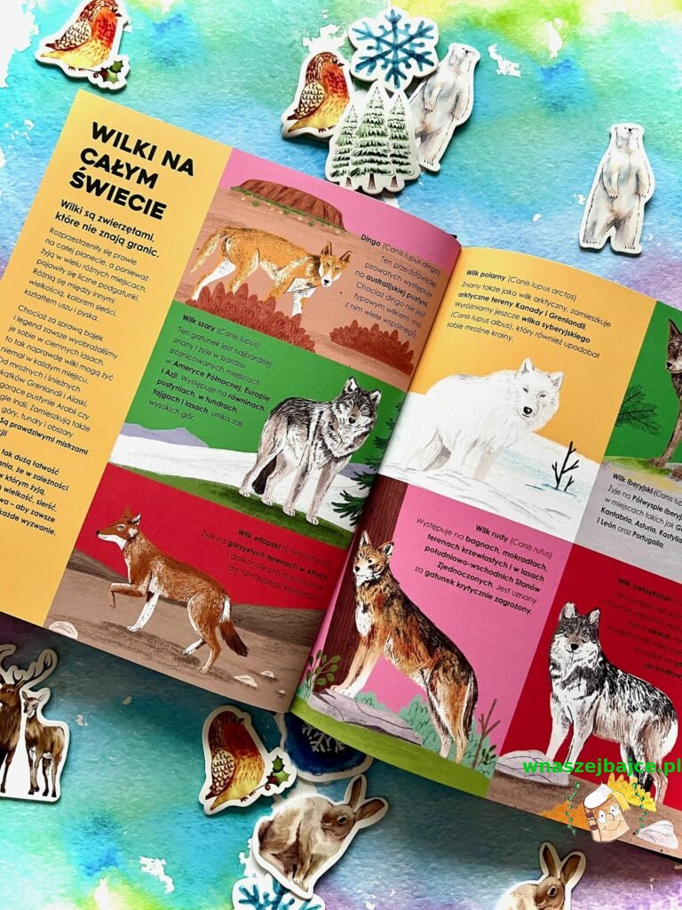 Już od pierwszych stron czujemy, że otwieramy coś wyjątkowego. Książka prowadzi nas przez pradawne dzieje wilków, ukazując, skąd się wzięły, od kiedy żyją na Ziemi i jak duża oraz różnorodna jest ich rodzina. Poznajemy wilka szarego, jednolicie białego i wiele innych podgatunków, które różnią się wielkością, ubarwieniem, kształtem pysków i uszu. Uświadamiamy sobie, jak niezwykła jest ich zdolność przystosowania się do środowiska, wilki są zwierzętami, które nie znają granic, rozprzestrzeniły się niemal na całej planecie, tworząc bogaty wachlarz form i odmian.