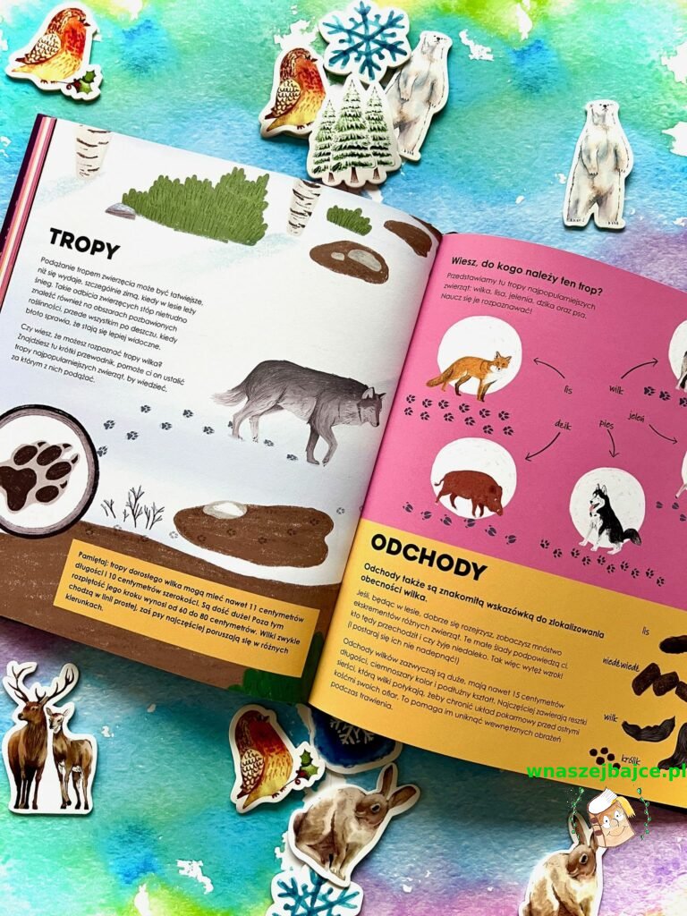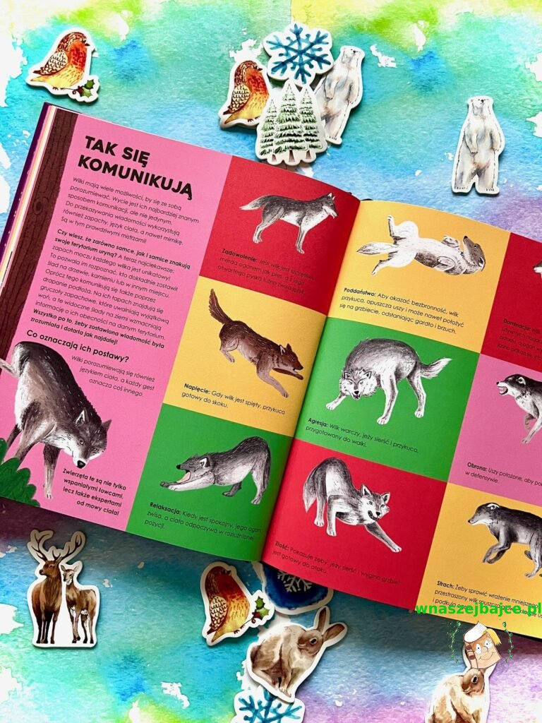 Książka odkrywa przed nami także wilcze menu. Dowiadujemy się, że podczas jednego posiłku wilk potrafi zjeść 3 – 4 kilogramy mięsa, a w razie potrzeby nawet 9 kilogramów naraz – to tyle, ile odpowiada około dwustu hot dogom 🙂 Poznajemy sposoby komunikacji wilków, ich głosy, postawy i sygnały, dzięki którym porozumiewają się w stadzie. Uczymy się rozpoznawać tropy, a także poznajemy ciekawostki o ich zmysłach, jak choćby fakt, że wilcze oczy nie świecą w ciemności, a jedynie odbijają światło, co pozwala im świetnie widzieć nocą.